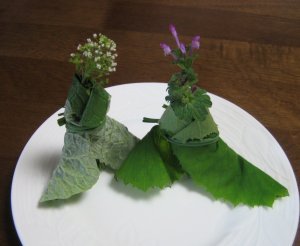 これは、着物が、蕗や牛蒡の葉で作っていて、お顔はナズナ、仏の座だそうです。帯は、ノビルの葉smile